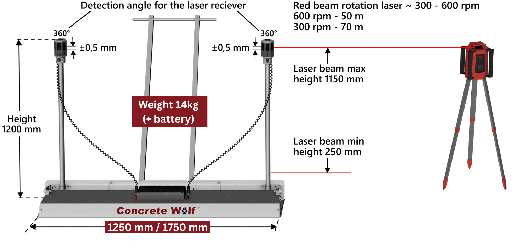 The Vibration Laser Screed works with all rotating red beam lasers. We do not include a rotating red laser with the device to avoid unnecessary expenses. If desired, it is possible to purchase the Stabila rotation laser LAR160 or LAR350 through us, ensuring an accuracy of ±1 mm.